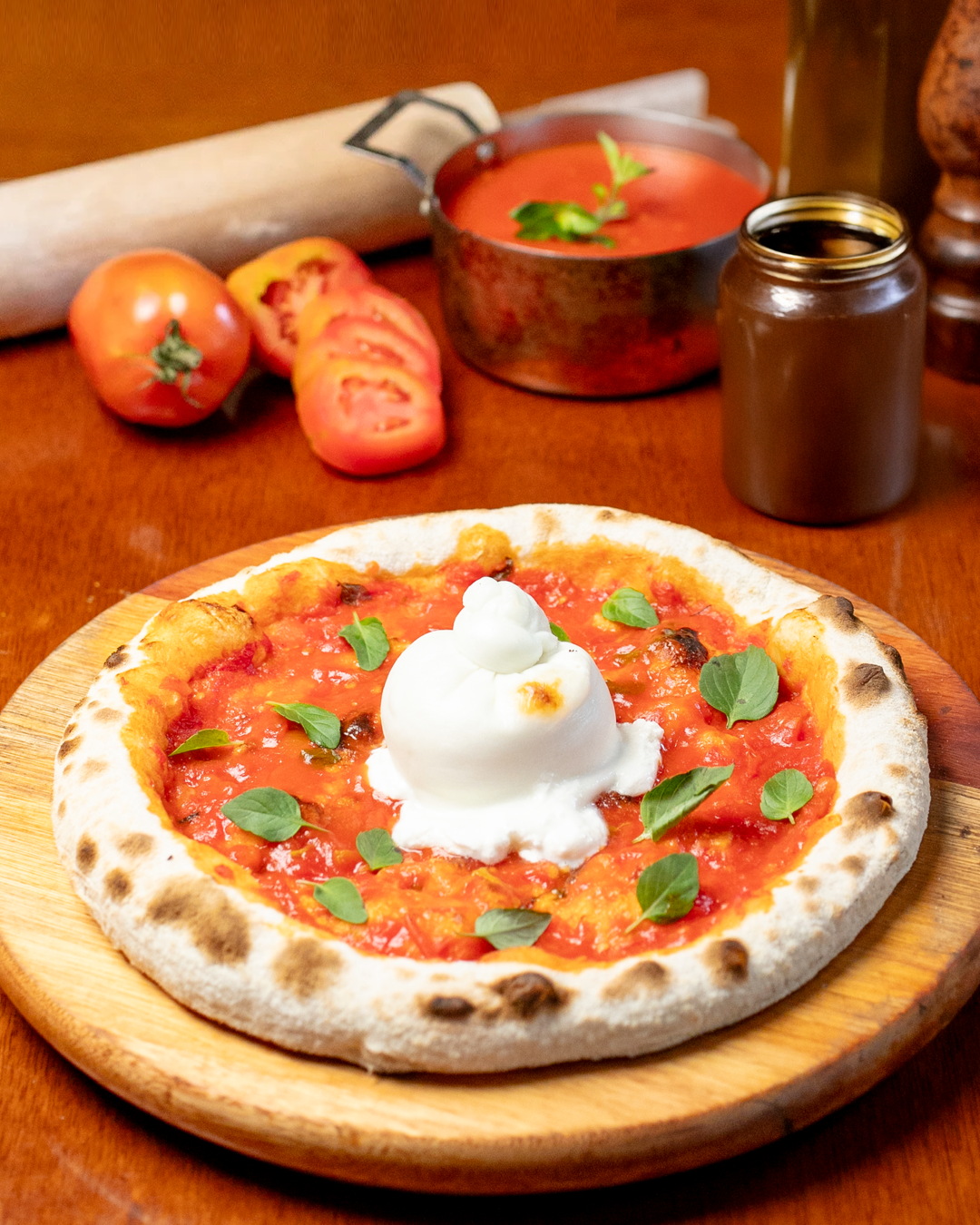 Pizza Burrata ao Pomodoro numa versão individual de 4 fatias. É uma levíssima massa com fermentação prolongada, molho de tomate italiano, burrata e manjericão, servida com Refrigerante (lata).