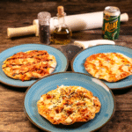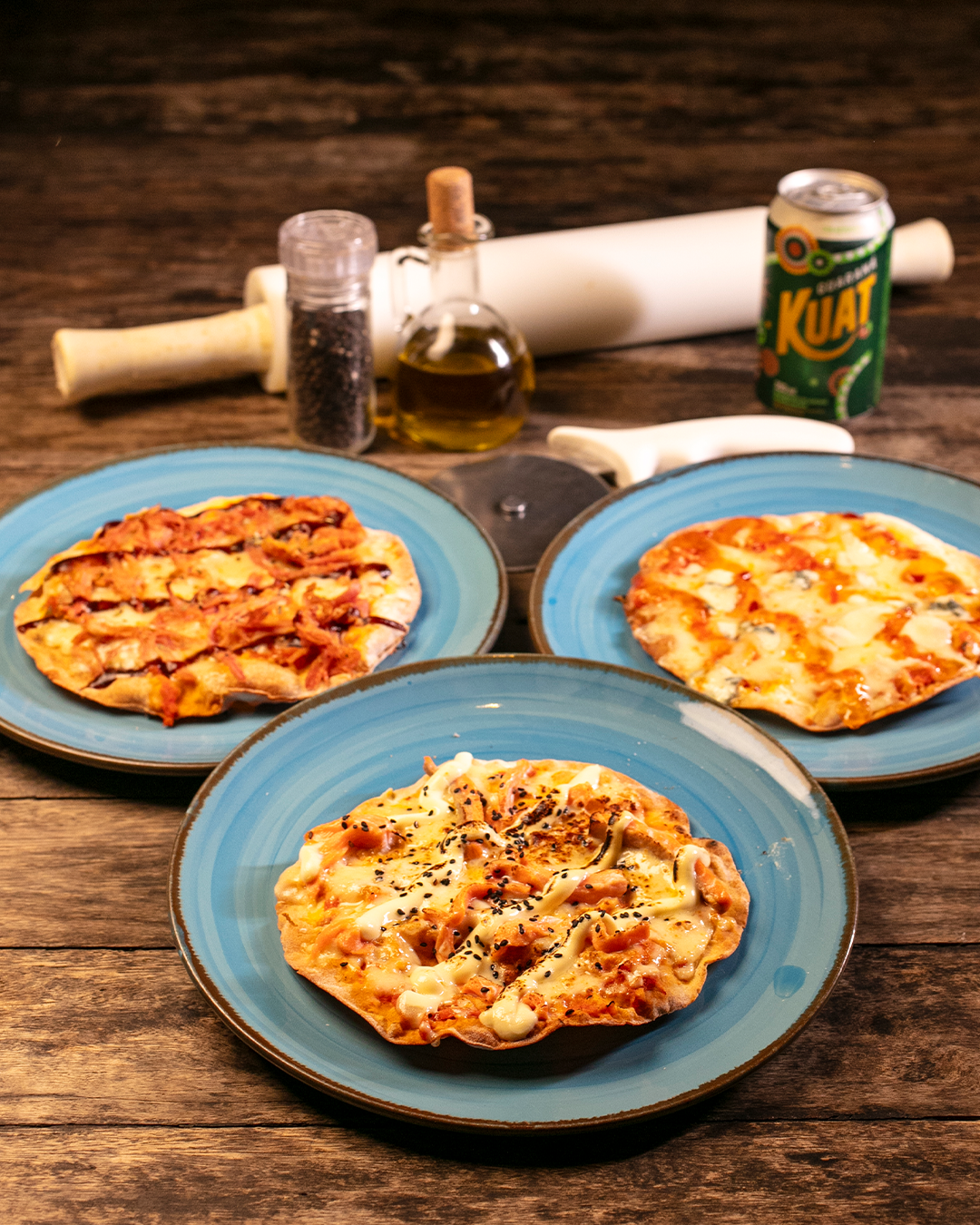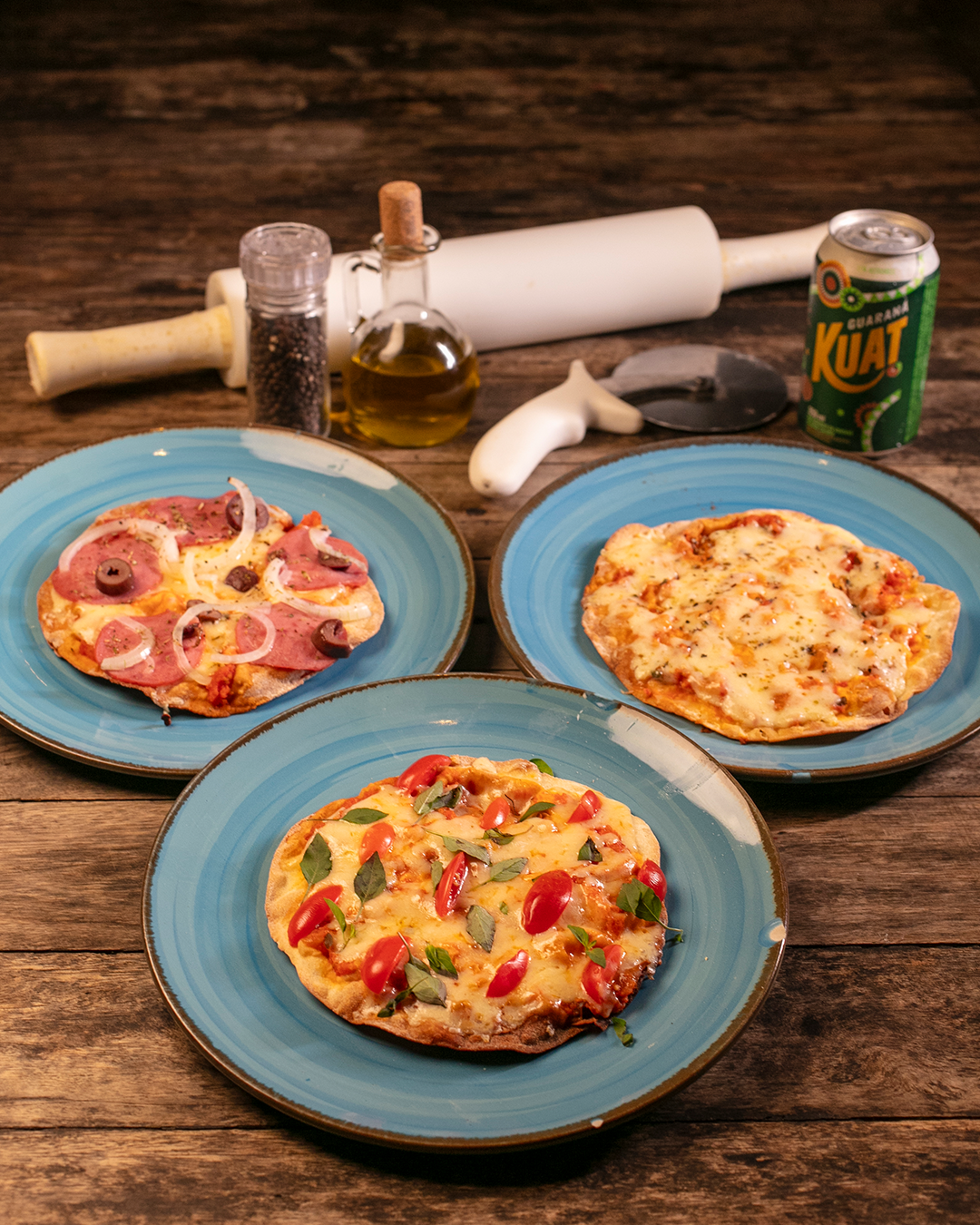 Combo Clássico – sabores Mussarela, Calabresa ou Marguerita, com três latas de refrigerante.