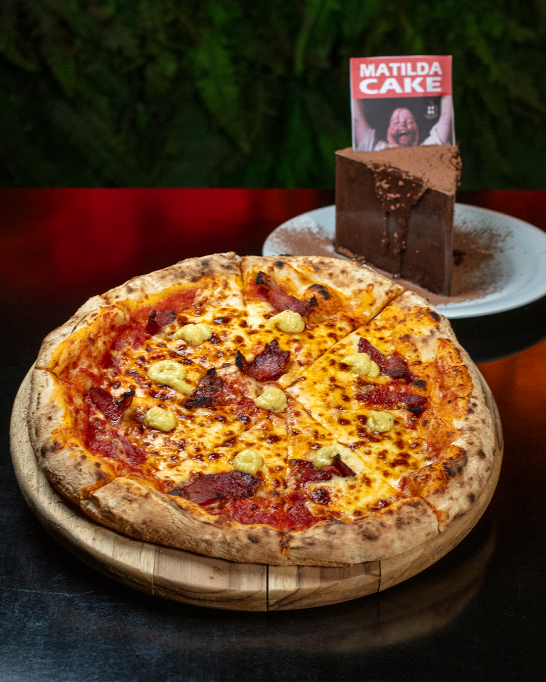 Escolha o sabor da pizza, e ela acompanha um MATILDA CAKE, de sobremesa, que é um delicioso bolo de chocolate recheado com ganache de chocolate, coberto com calda de chocolate, igual ao do bolo Matilda.
