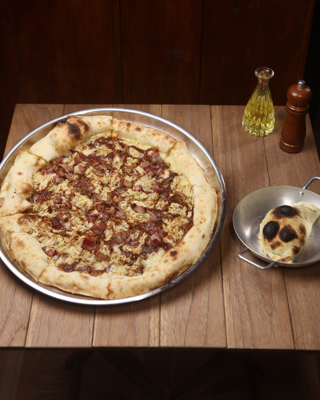 1 Pizza tamanho G (podendo ser até 2 sabores) entre Calabresa, Pepperoni, Cogumelo Pork ou com a novidade: Chicken BBQ – Frango desfiado suculento, queijo, bacon e molho barbecue com uma Empanada de S’Mores – Massa crocante recheada com chocolate derretido, marshmallow. Uma sobremesa clássica americana em versão irresistível. Acompanham 2 refrigerantes (latinha).