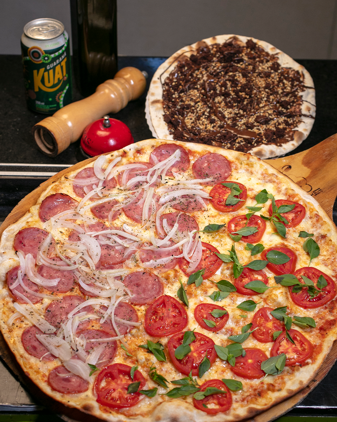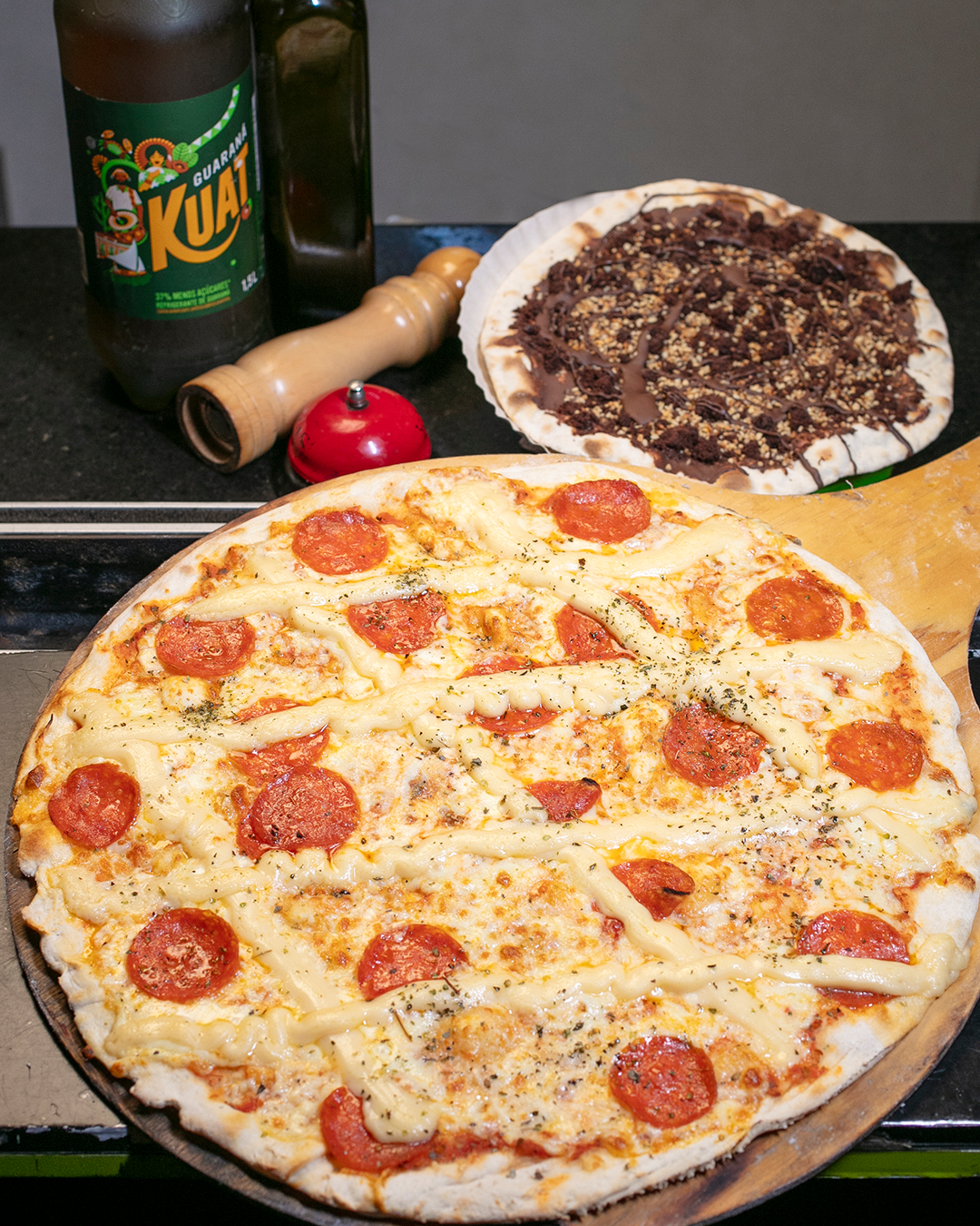 Combo 1: Pizza de Pepperoni com catupiry e uma pizza brotinho doce de brownie.