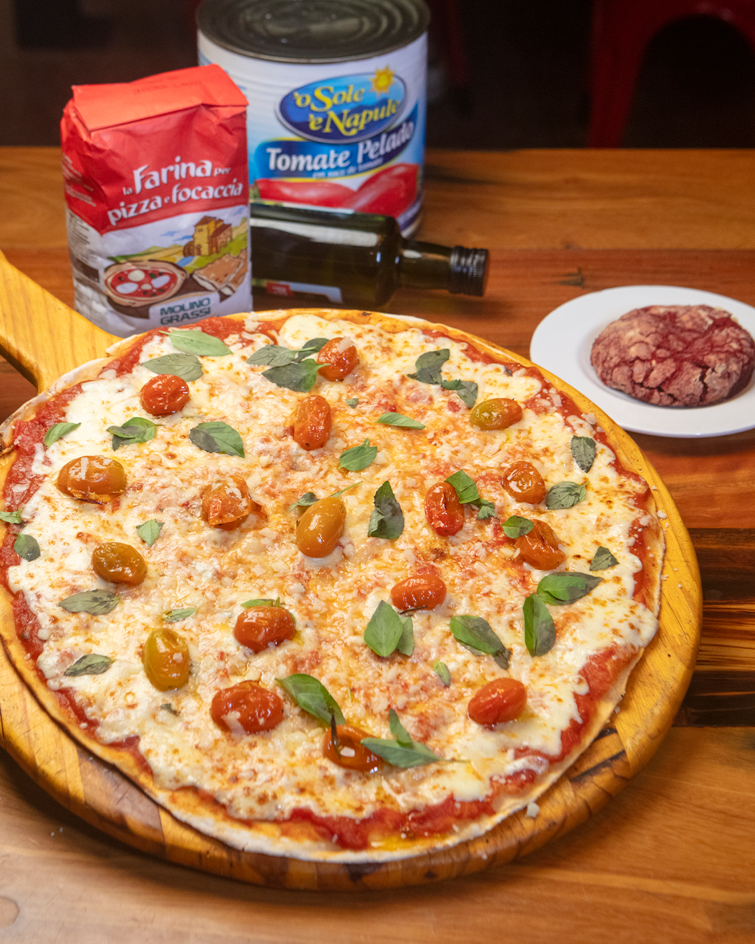Combo 2: Pizza Grande Margherita do Chef: molho de tomate da casa, queijo muçarela, tomate confit, parmesão curado e folhas de manjericão. + Sobremesa