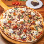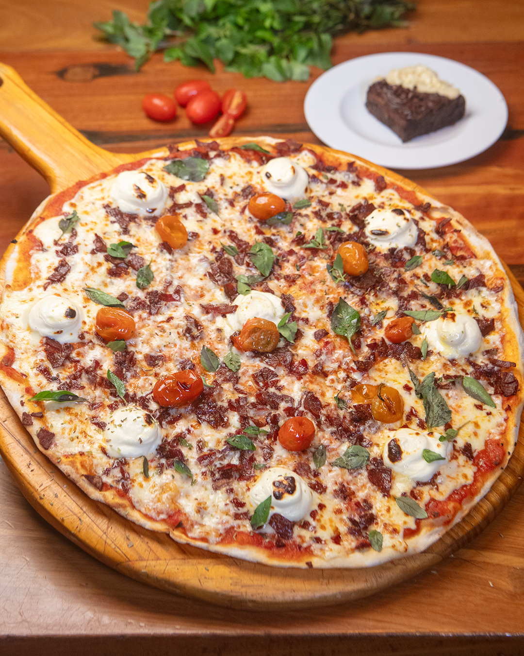 Combo 1: Pizza Grande Calabresa do Chef: molho de tomate da casa, queijo muçarela, calabresa crocante, tomate confit, cream cheese, folhas de manjericão e orégano + Sobremesa